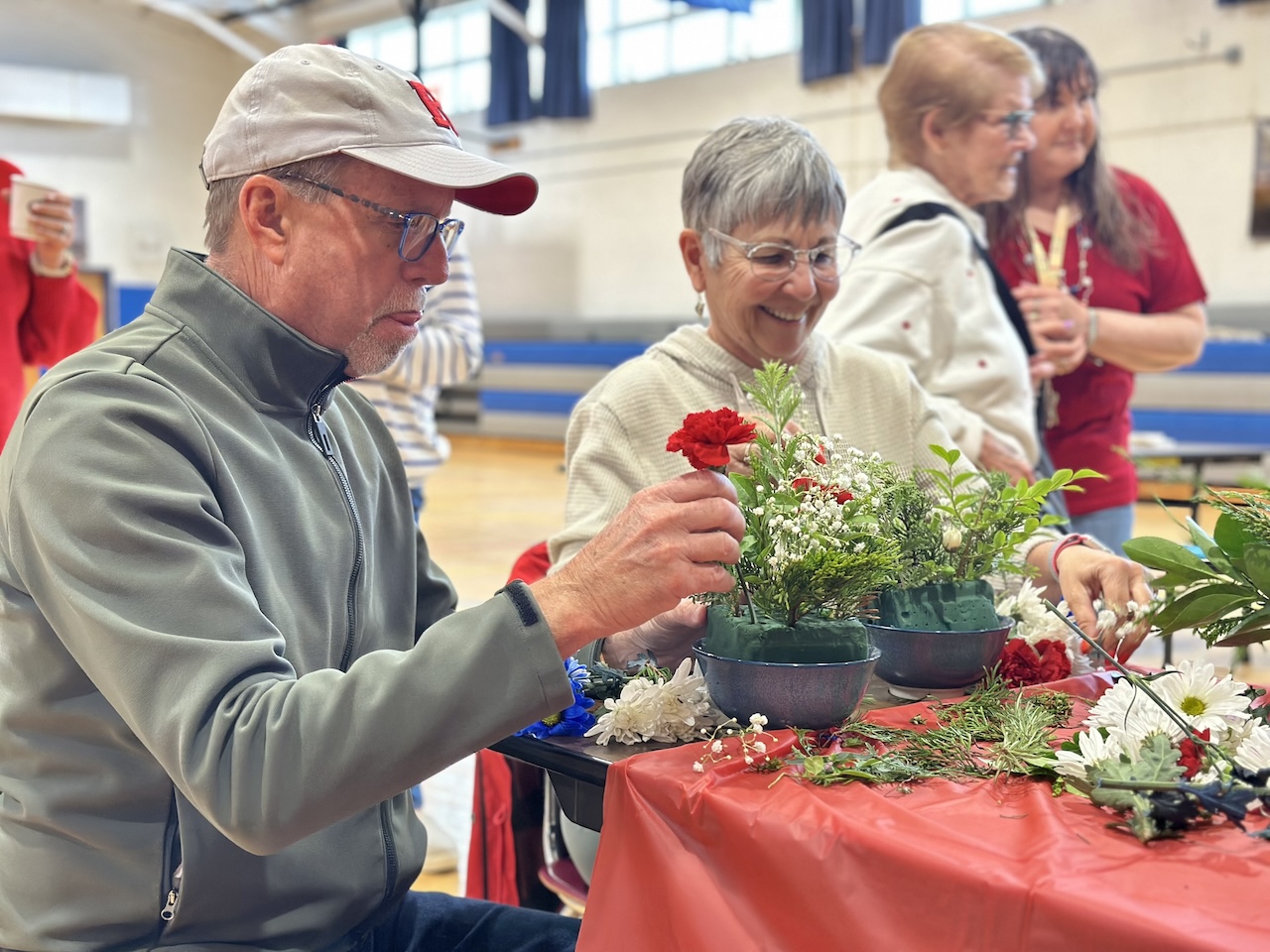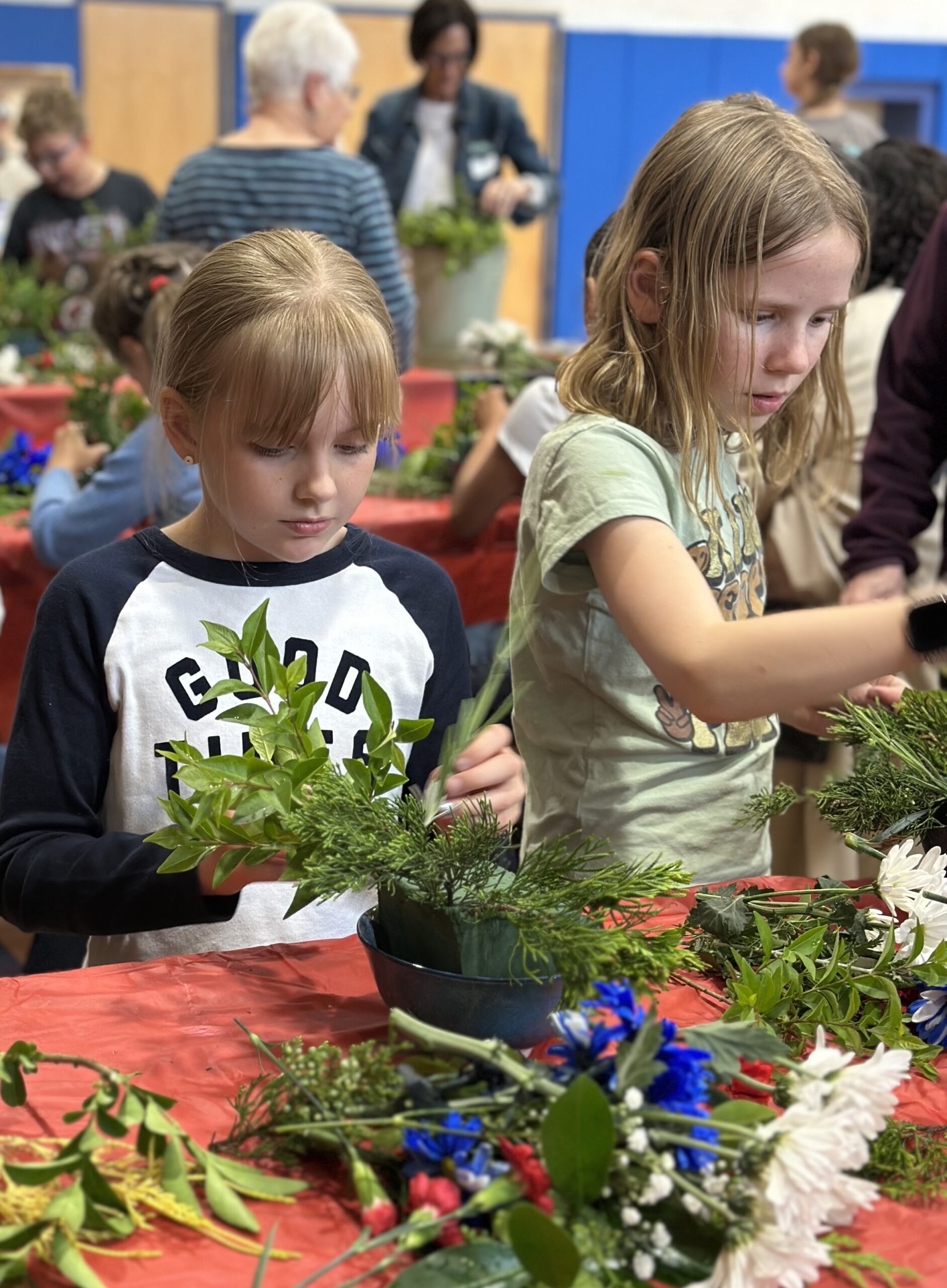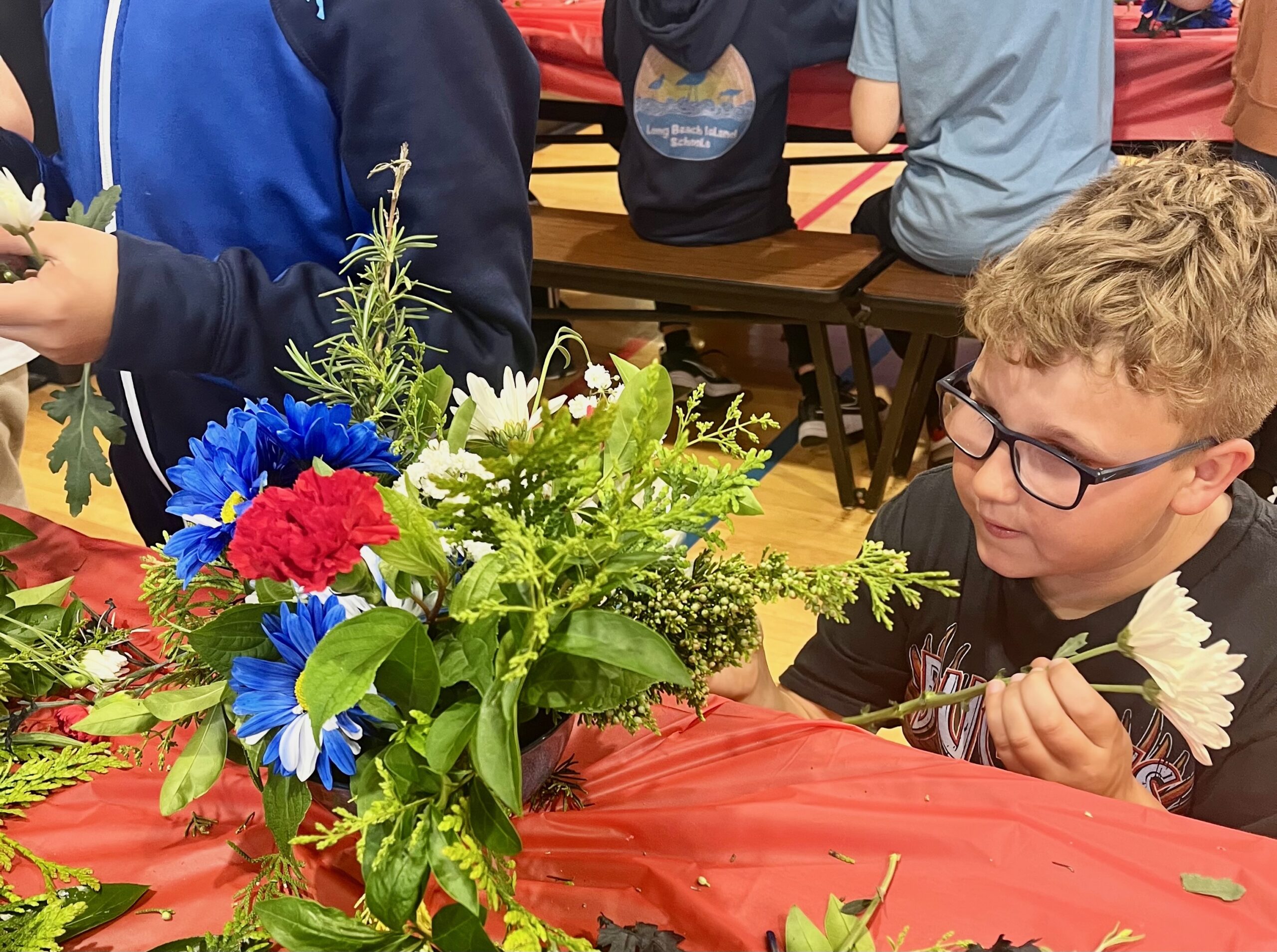 Together, the eighteen students and twelve grandparents crafted red, white, and blue floral arrangements in celebration of Memorial Day. The arrangements featured red carnations and white and blue daisies adorned with greenery. Each student was delighted to bring home their floral creations along with American flags.