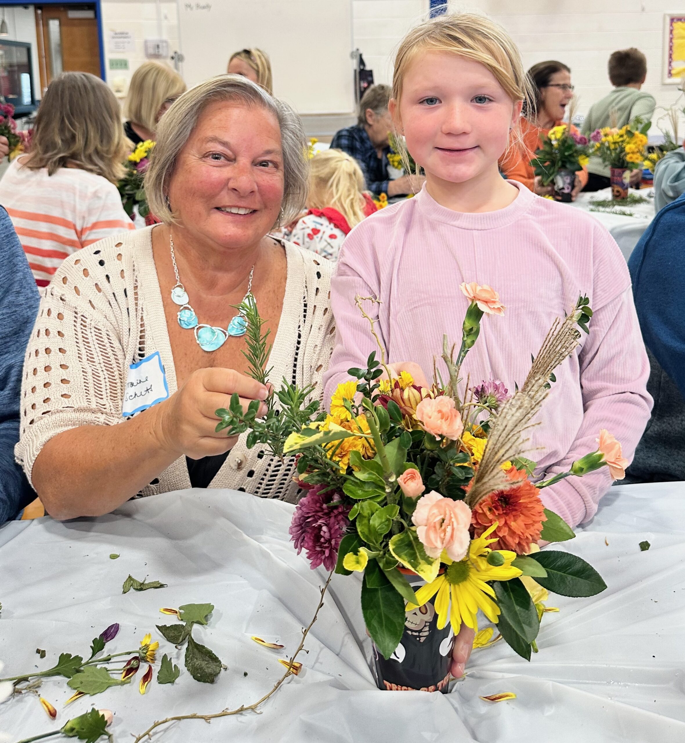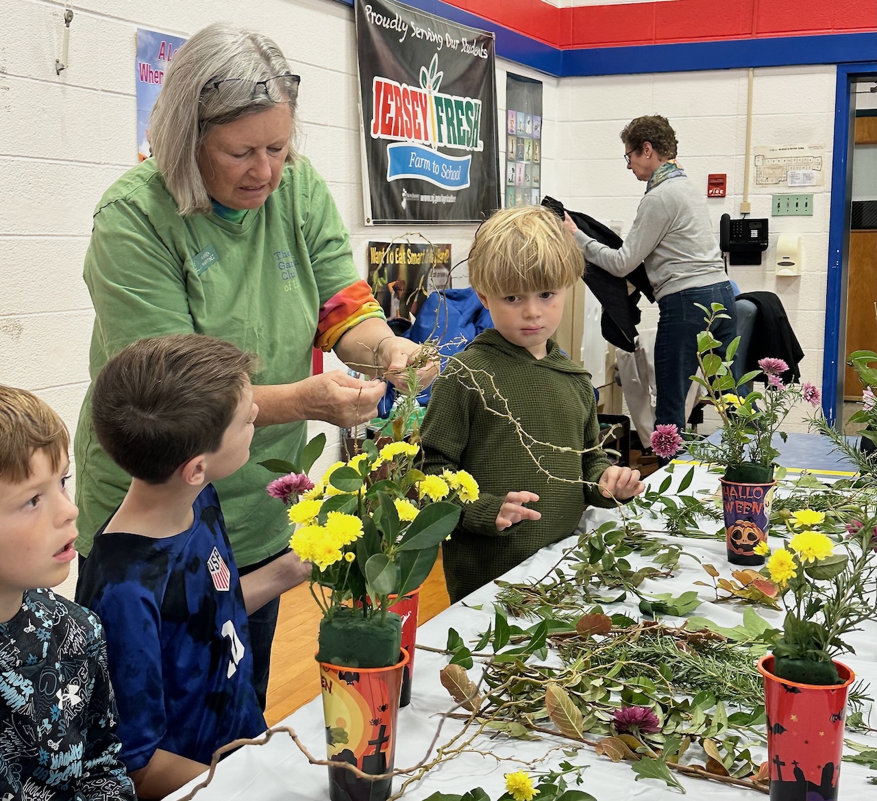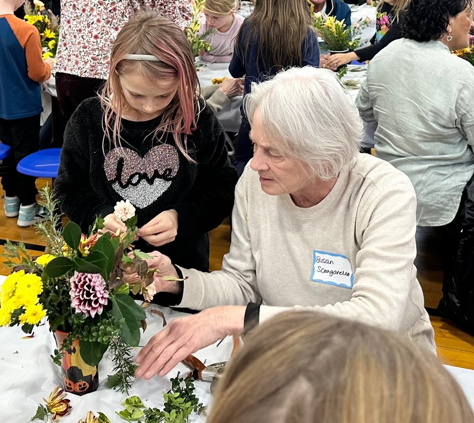 On Tuesday, October 29, 2024, children from preschool through 3rd grade at the Beach Haven School, together with their parents and grandparents, crafted Halloween floral arrangements guided by the Intergenerational Committee of The Garden Club of LBI.