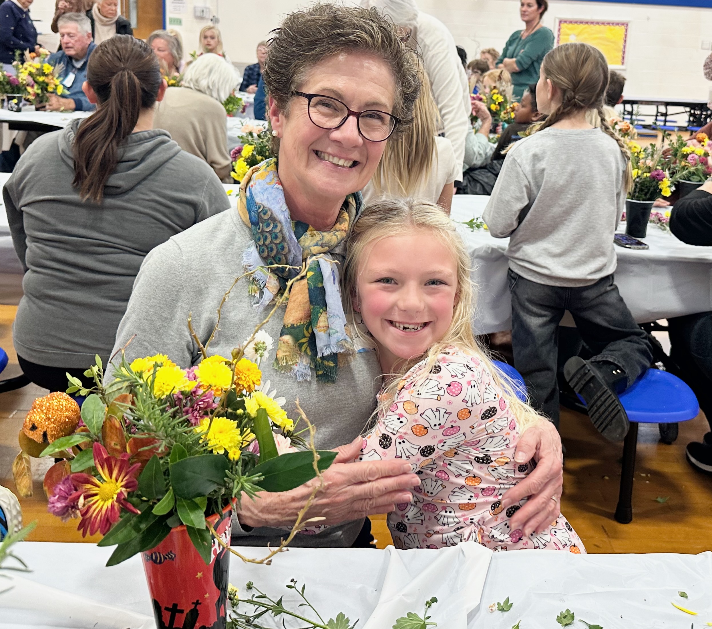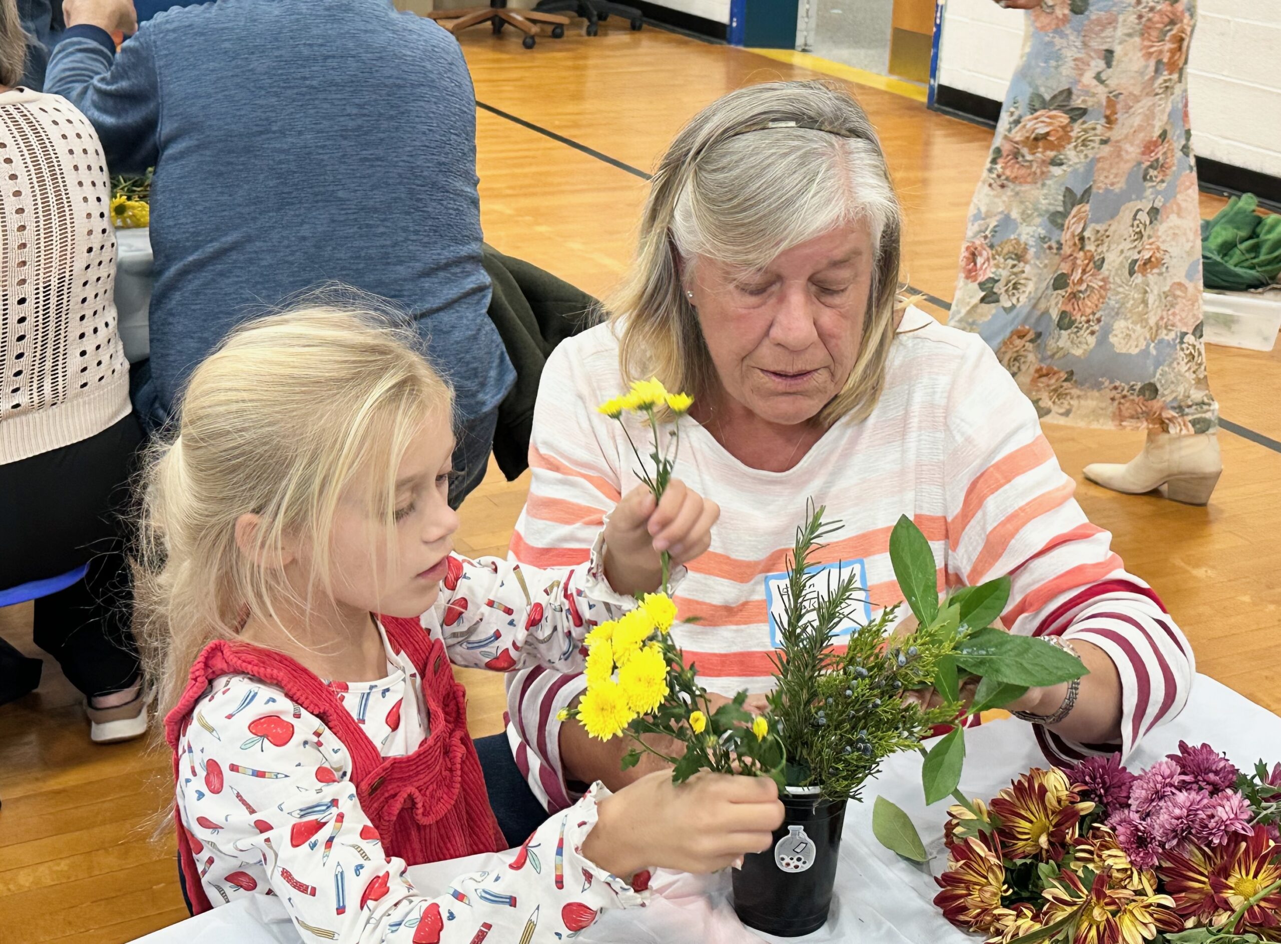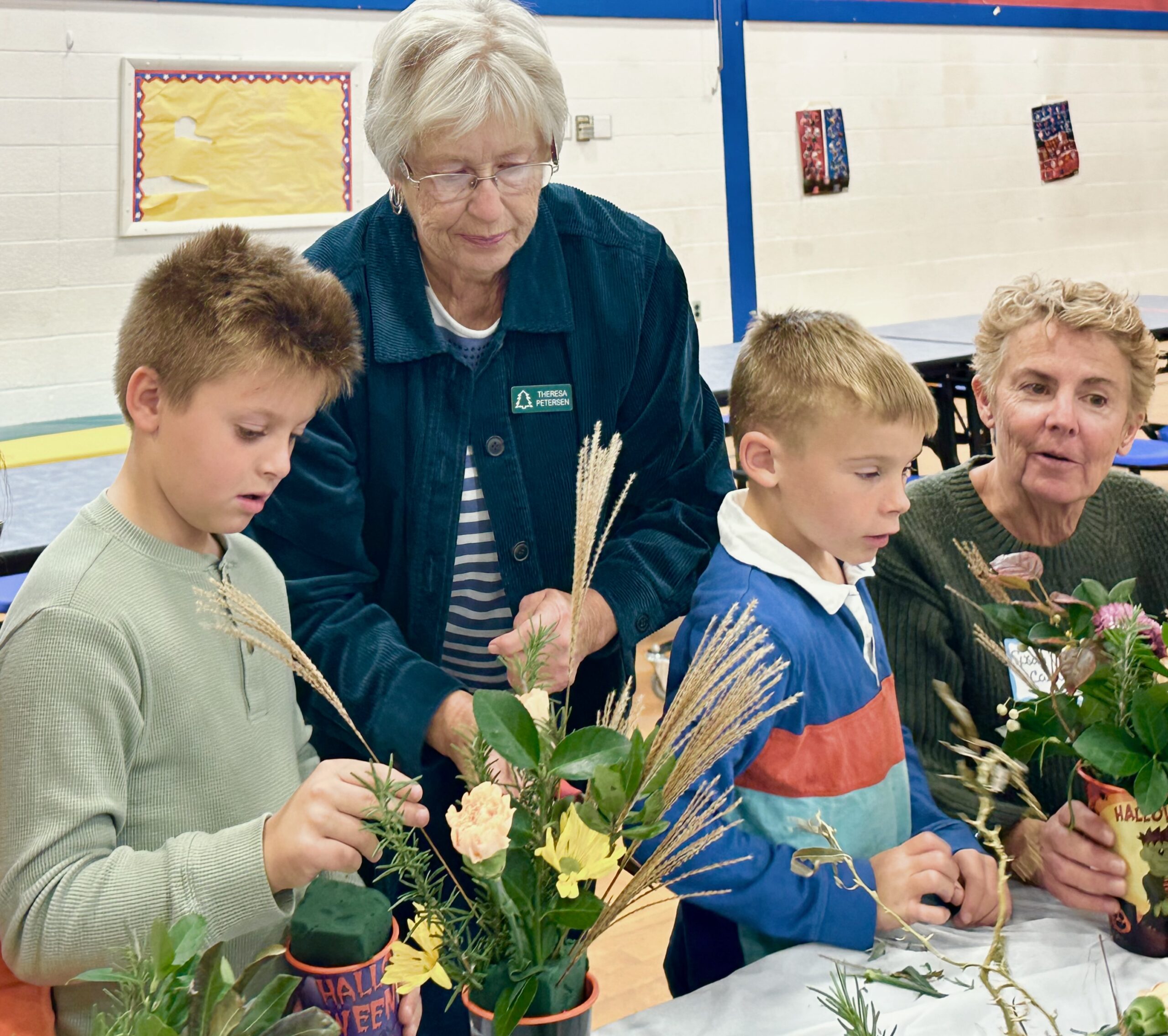 On Tuesday, October 29, 2024, children from preschool through 3rd grade at the Beach Haven School, together with their parents and grandparents, crafted Halloween floral arrangements guided by the Intergenerational Committee of The Garden Club of LBI.