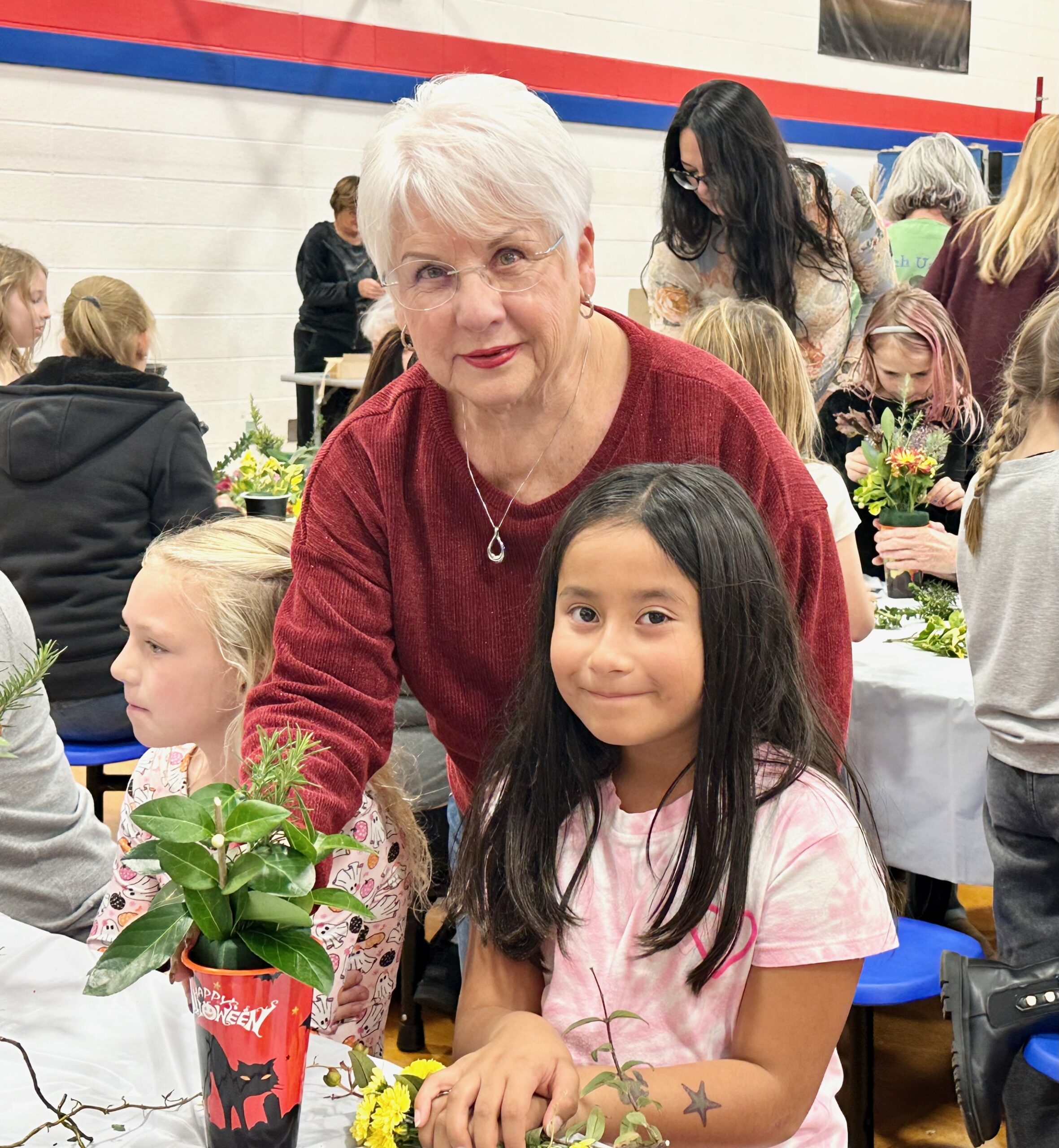 On October 28, 2025, approximately 20 members of the Garden Club gathered with second graders and their grandparents at Ethel Jacobsen Elementary School in Surf City to craft Halloween-themed centerpieces for the students to take home. A total of 26 students and at least 30 grandparents participated in the event! The joy on their faces as they collaborated was truly wonderful! The centerpieces they created surpassed our expectations, with each one being a unique masterpiece.