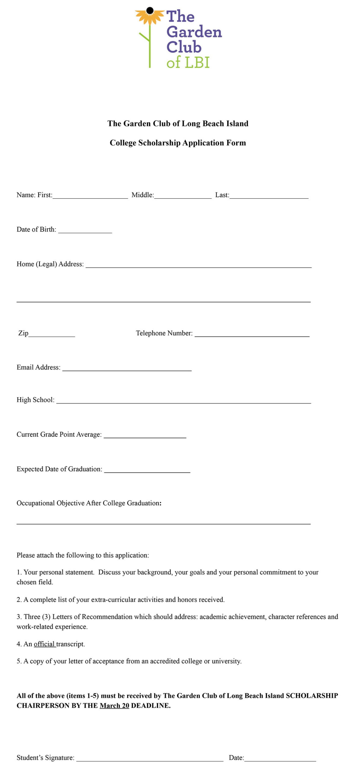 - Garden Club of Long Beach Island Scholarship Award Application form