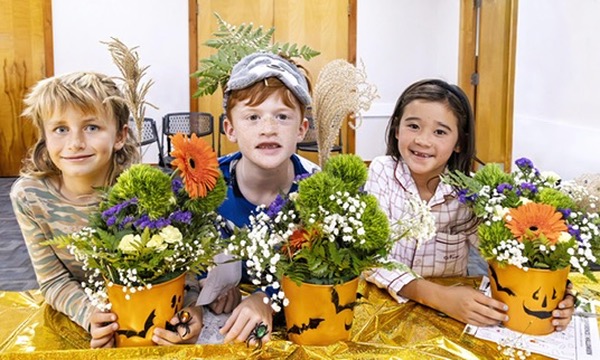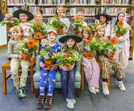The Youth Committee of the Garden Club of LBI met for its inaugural program of the 2025-2026 school year on Wednesday October 22, 2025 at the LBI Branch of the Ocean County Library-Surf City to create a seasonal Halloween floral arrangement. Many of the young floral designers, grades 3-6, came dressed in their PJ’s as it was “Pajama Day” at the LBI Ethel Jacobson School .The program was lead by co-chairs Ginny Scarlatelli and Jeannette Michelson, along with Garden Club members Paula Cofone and Pauline Gertzen,