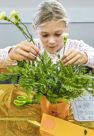 The Youth Committee of the Garden Club of LBI, lead by co-chairs Jeannette Michelson and Ginny Scarlatelli, along with members Paula Cofone and Pauline Gertzen, met at the Surf City library with local 3rd-6th graders on Wednesday October 2, 2024 to create an autumnal harvest moon flower arrangement.