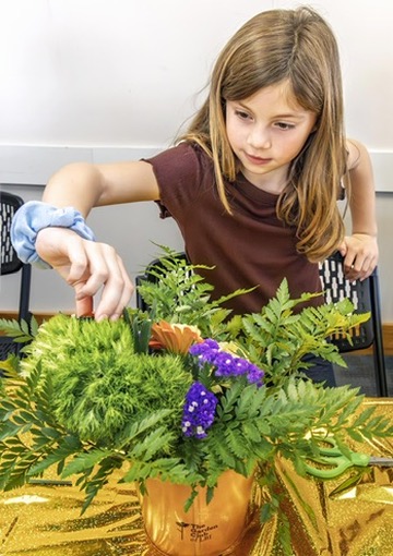 The group, lead by co-chairs Ginny Scarlatelli and Jeannette Michelson along with members Paul Cofone and Pauline Gertzen, guided the students with their designs. Local greens which included euonymus, juniper and bayberry, formed the foundation of the arrangements. Next came yellow alstroemerias, creamy white carnations and goldenrod. Small, colorful peppers and Brussel sprouts were also incorporated into the harvest arrangements. Cut-out hand-decorated, goggly-eyed turkeys topped the designs. Each child went home with a unique and festive Thanksgiving arrangement to grace the family holiday table.