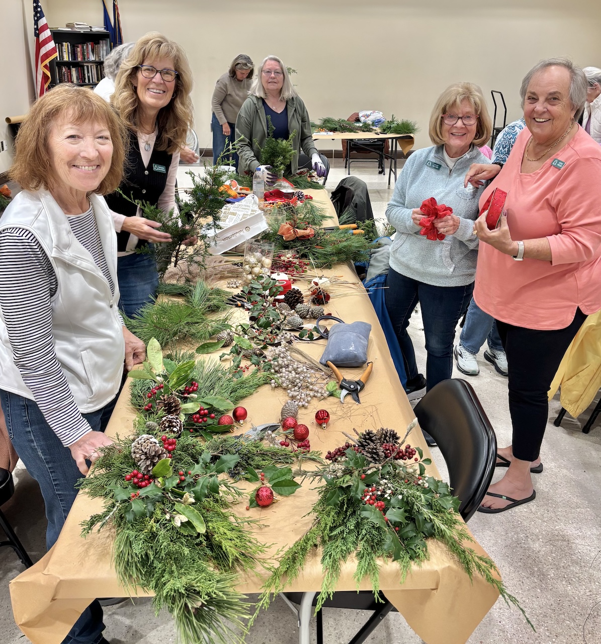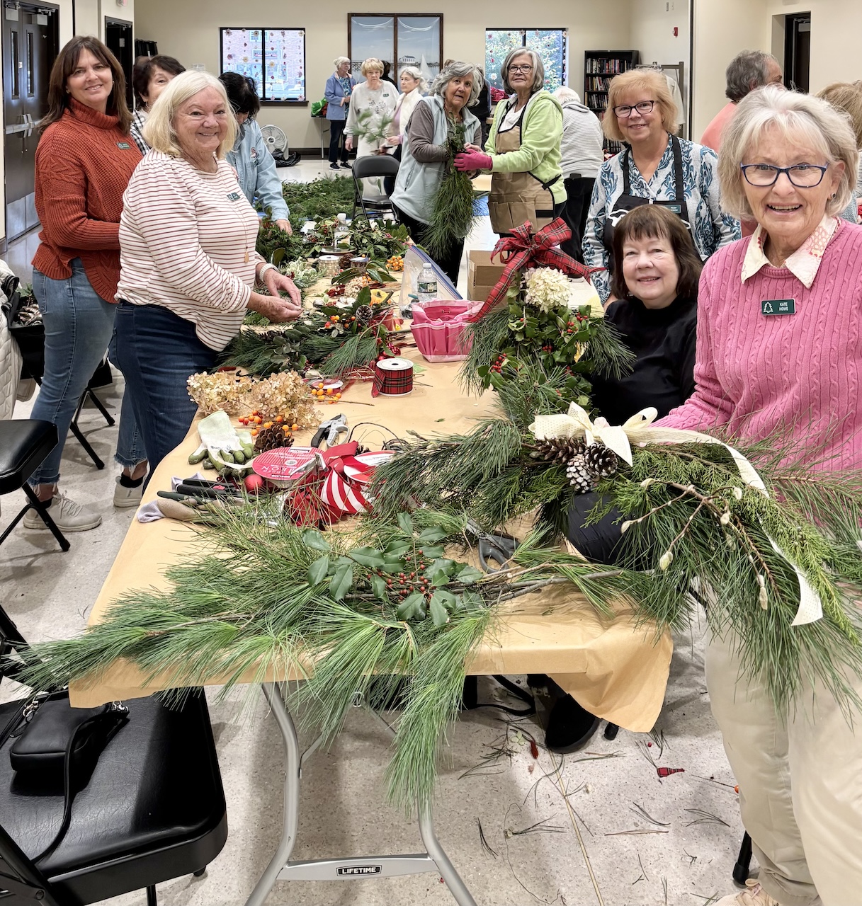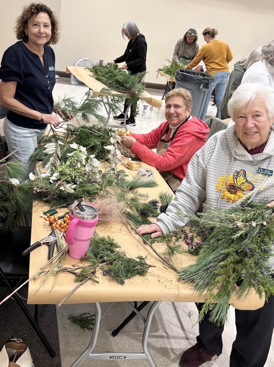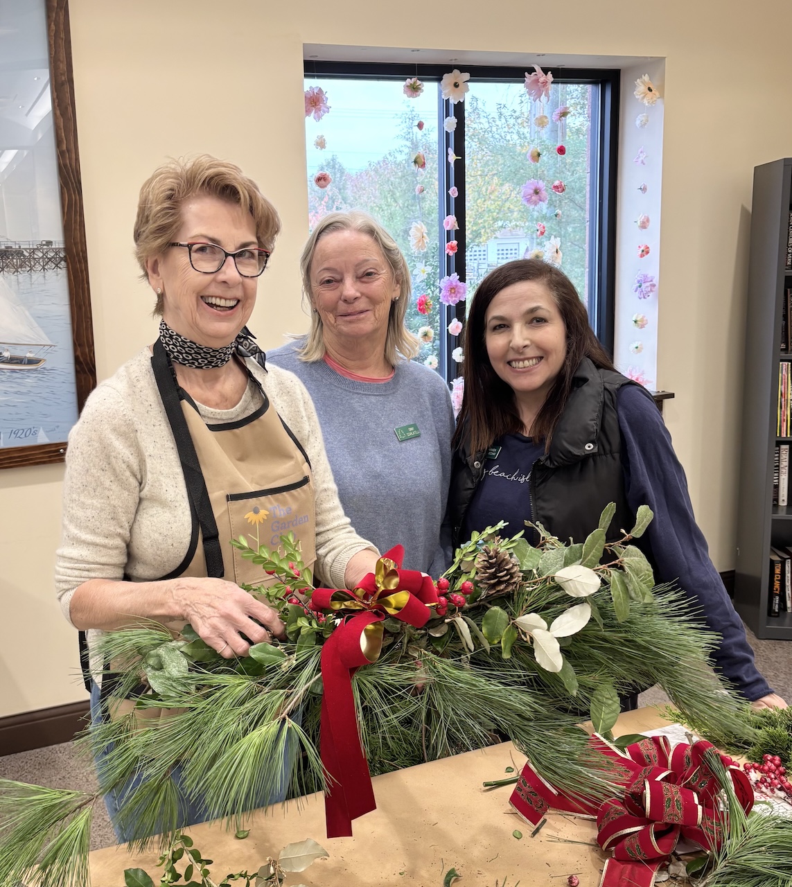 Garden Club members Marg Girardo, Ginny Darvas, and Carol Anne DiMeglio hosted a fun and inspiring workshop on Wednesday, October 29, 2025, to help house decorators gain confidence in creating beautiful greens arrangements for the 58th Holiday Tour of Homes. Participants enjoyed getting hands-on experience crafting both festive fall and holiday swags to adorn tables and doors!