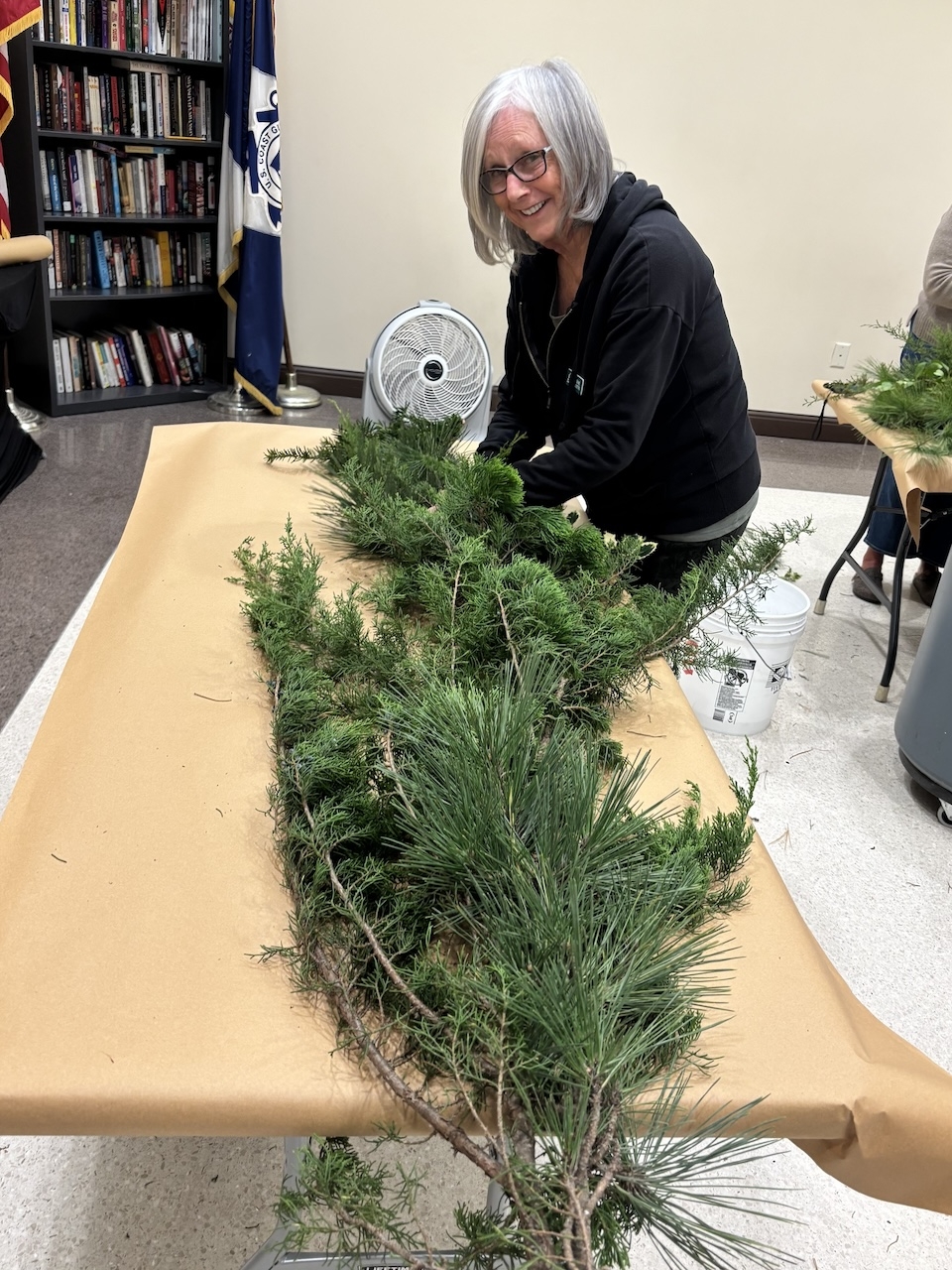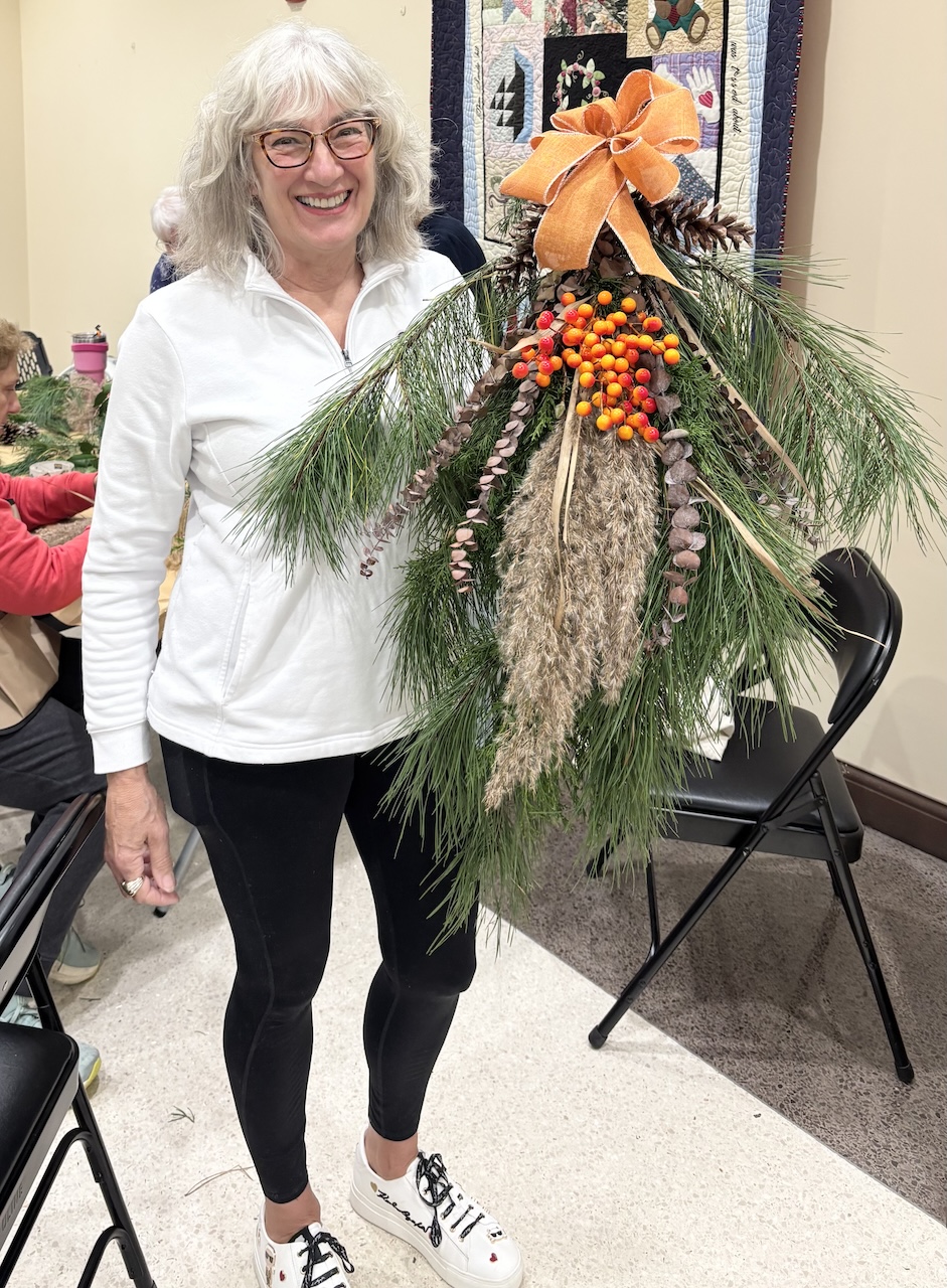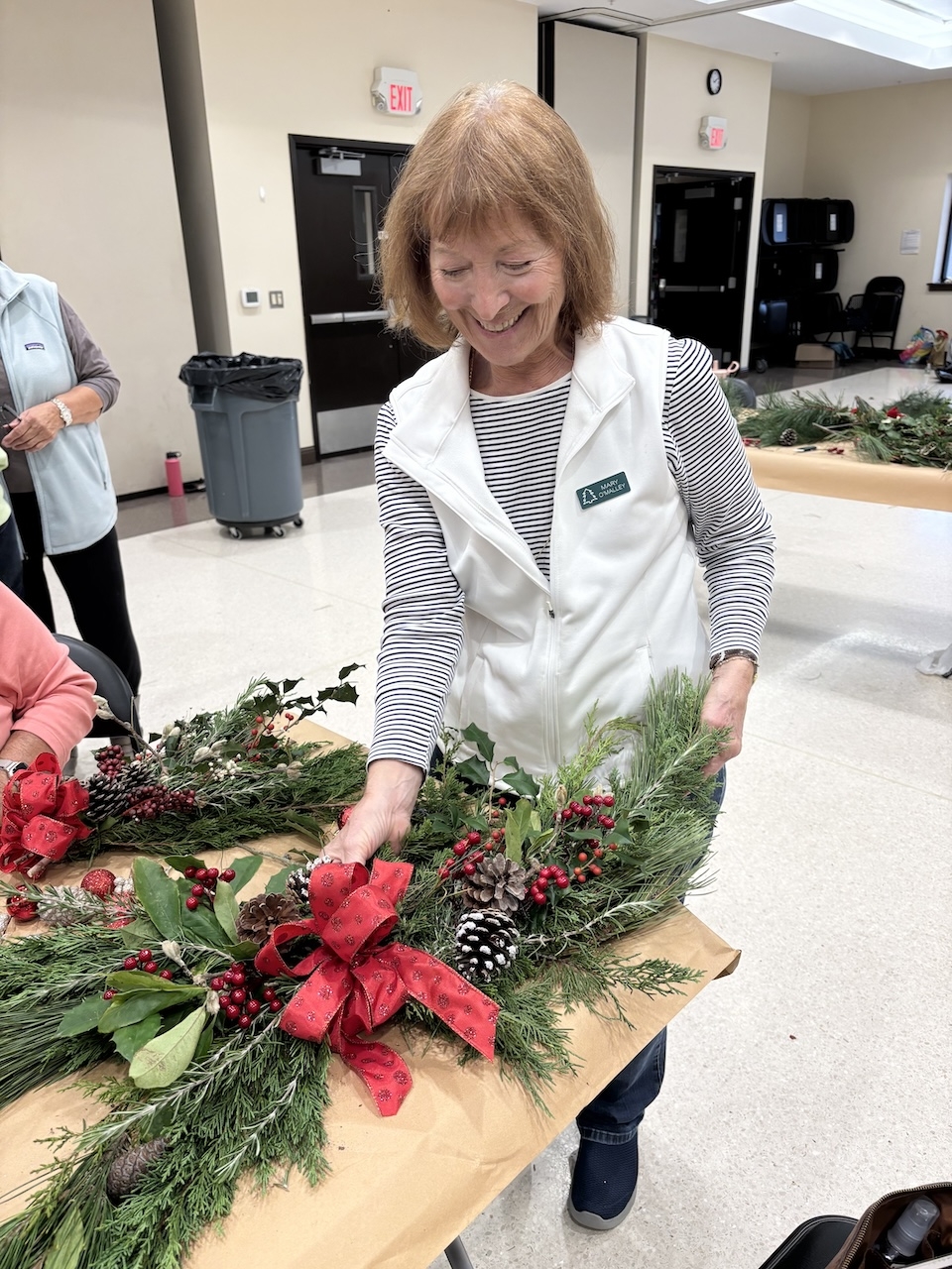 Garden Club members Marg Girardo, Ginny Darvas, and Carol Anne DiMeglio hosted a fun and inspiring workshop on Wednesday, October 29, 2025, to help house decorators gain confidence in creating beautiful greens arrangements for the 58th Holiday Tour of Homes. Participants enjoyed getting hands-on experience crafting both festive fall and holiday swags to adorn tables and doors!