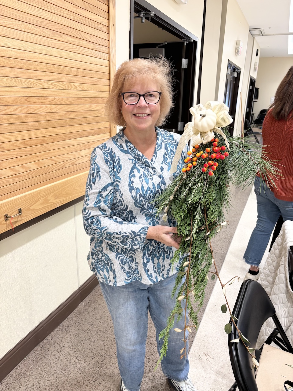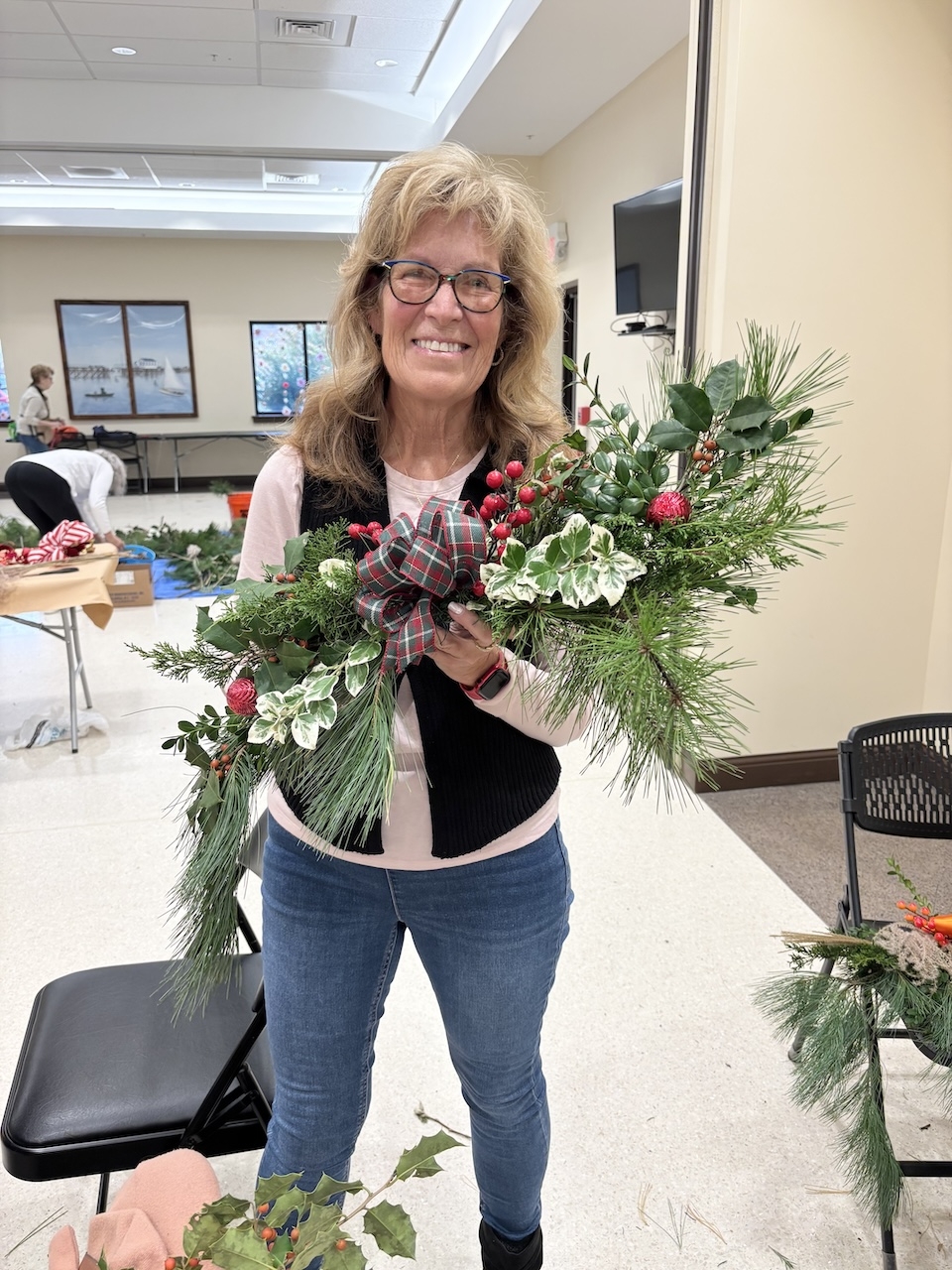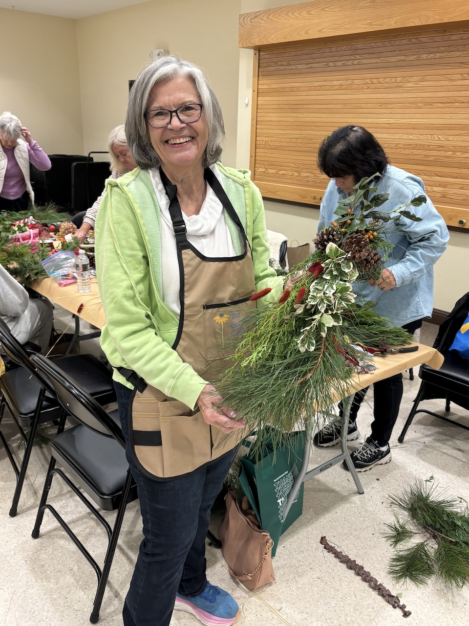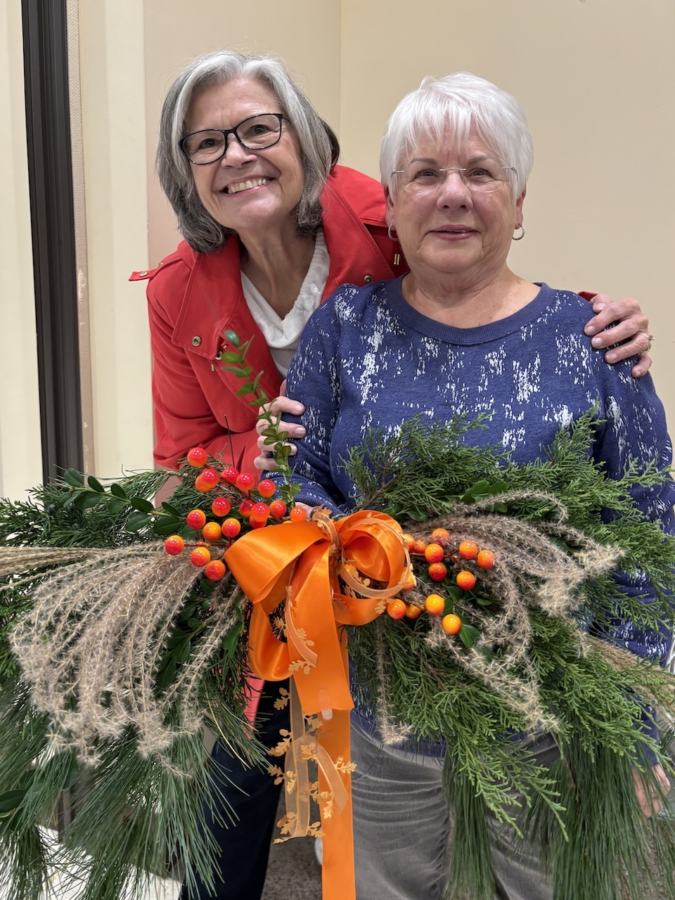 Garden Club members Marg Girardo, Ginny Darvas, and Carol Anne DiMeglio hosted a fun and inspiring workshop on Wednesday, October 29, 2025, to help house decorators gain confidence in creating beautiful greens arrangements for the 58th Holiday Tour of Homes. Participants enjoyed getting hands-on experience crafting both festive fall and holiday swags to adorn tables and doors!