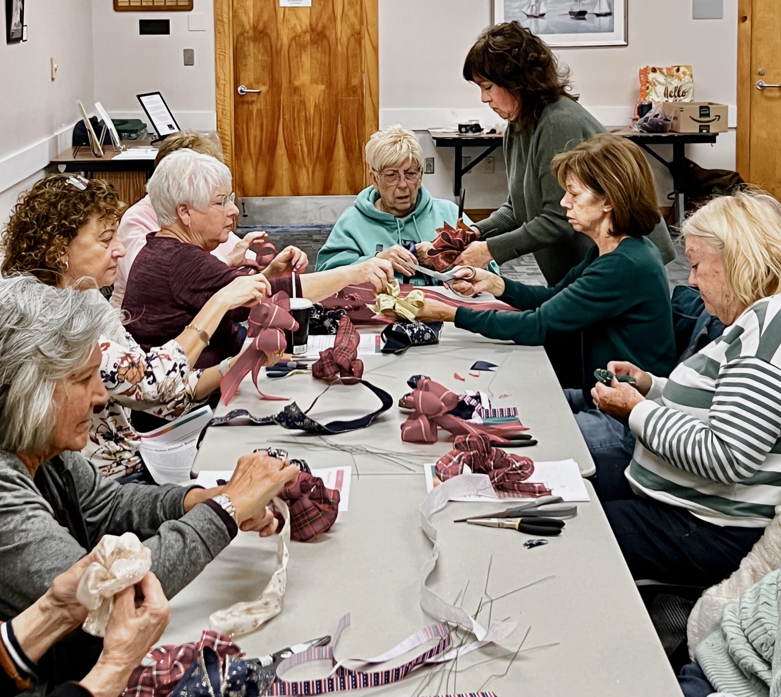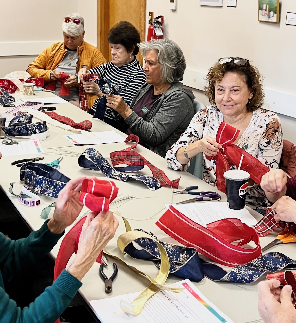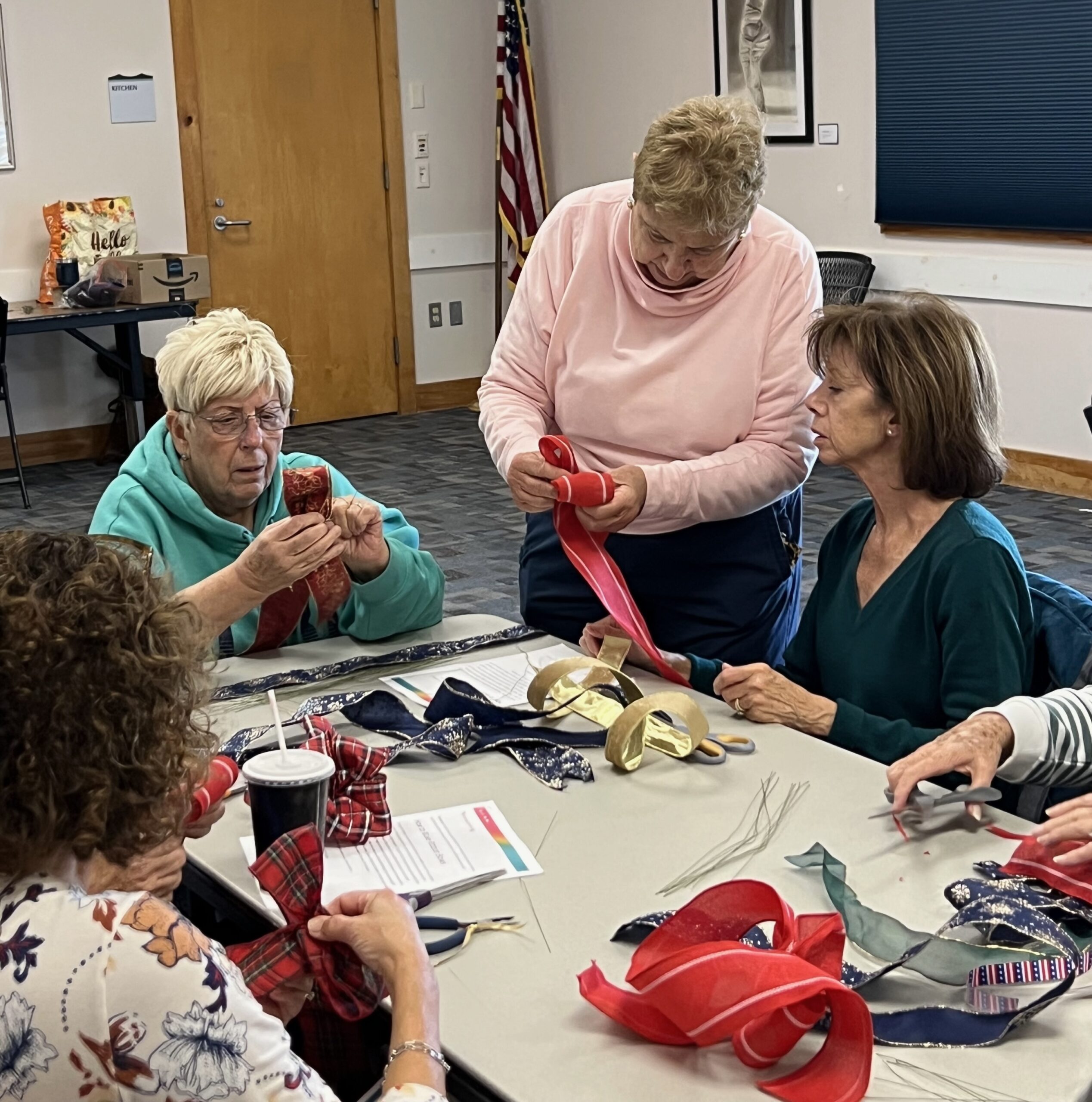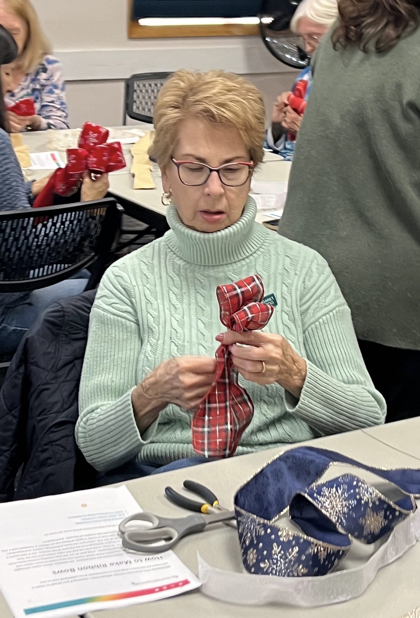 Garden Club members participated in a Bow Making workshop hosted by Marie McCafferty on November 4, 2025 to learn how to make beautiful bows for holiday decorating. Participants received wonderful hands-on training from both Marie and President JoAnne McKee, allowing them to practice this skill using a variety of ribbon types. It was a fun, glitter-filled afternoon for all!