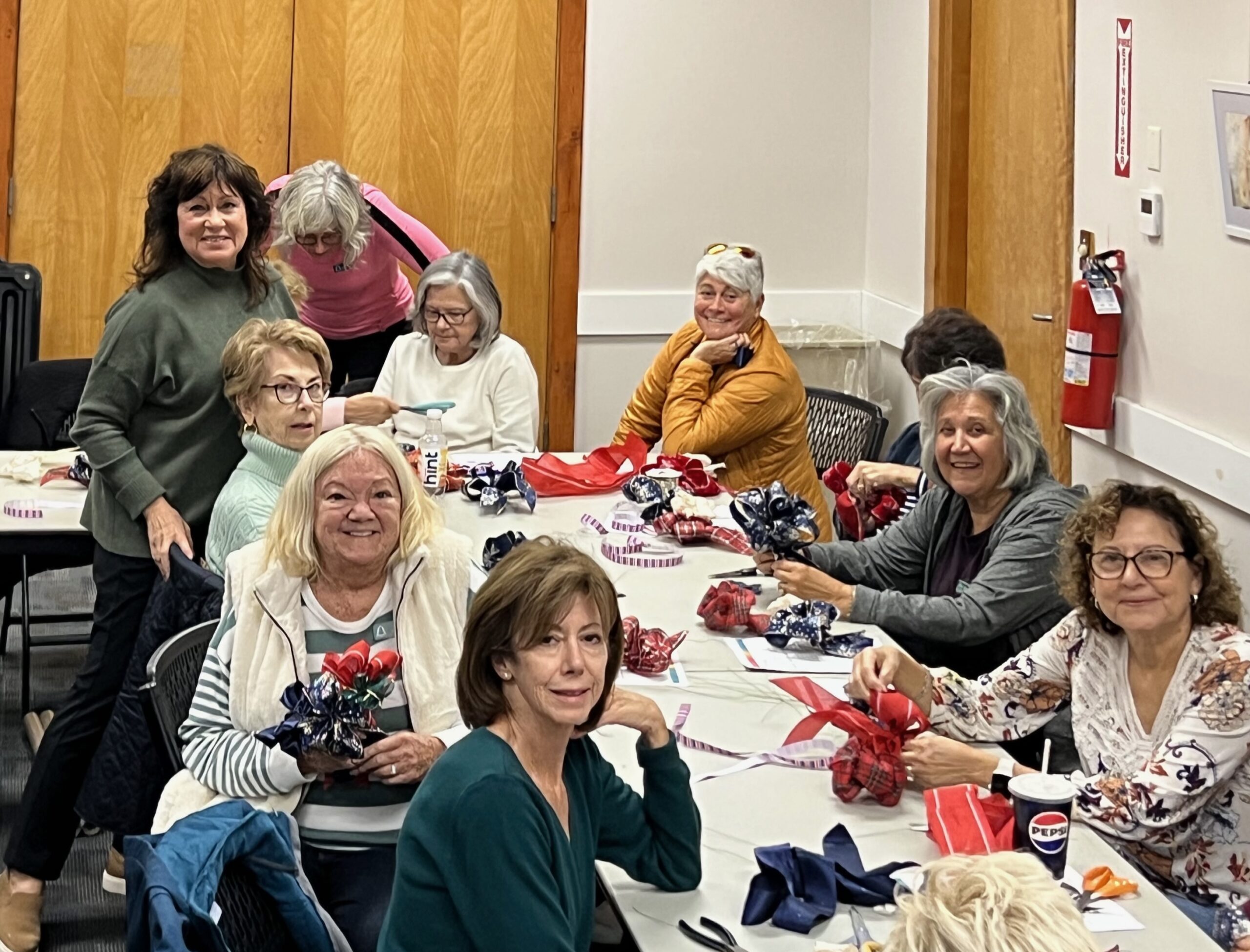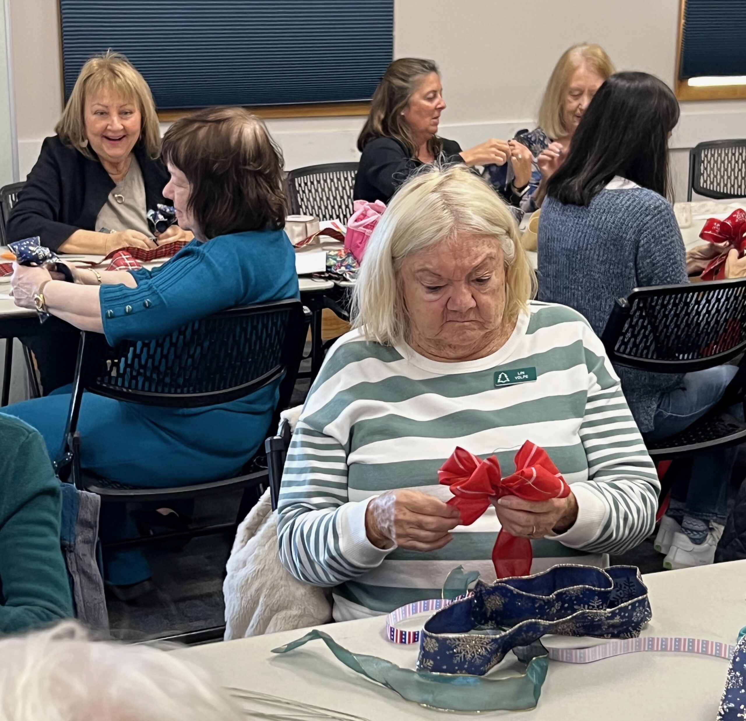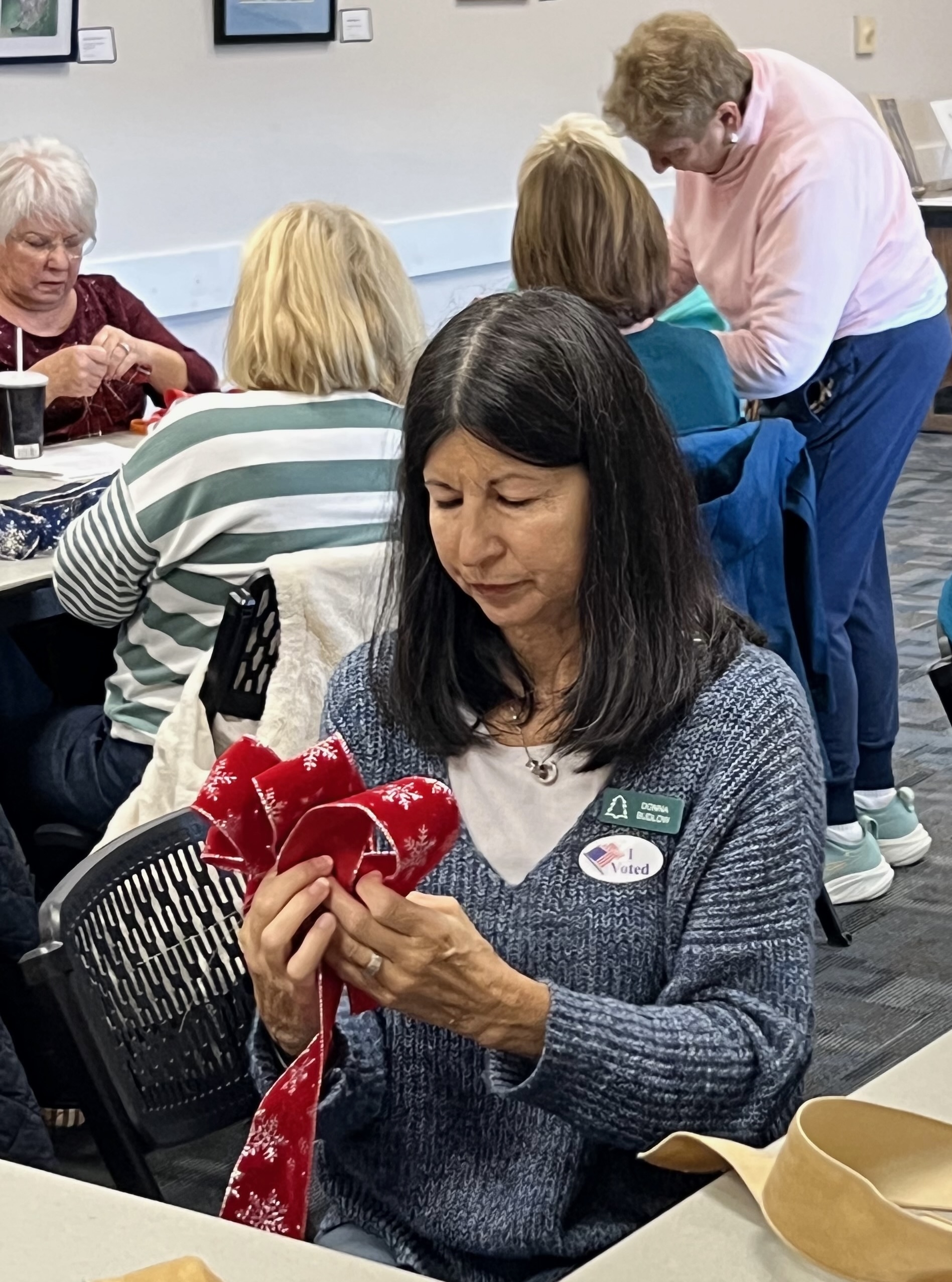 Garden Club members participated in a Bow Making workshop hosted by Marie McCafferty on November 4, 2025 to learn how to make beautiful bows for holiday decorating. Participants received wonderful hands-on training from both Marie and President JoAnne McKee, allowing them to practice this skill using a variety of ribbon types. It was a fun, glitter-filled afternoon for all!