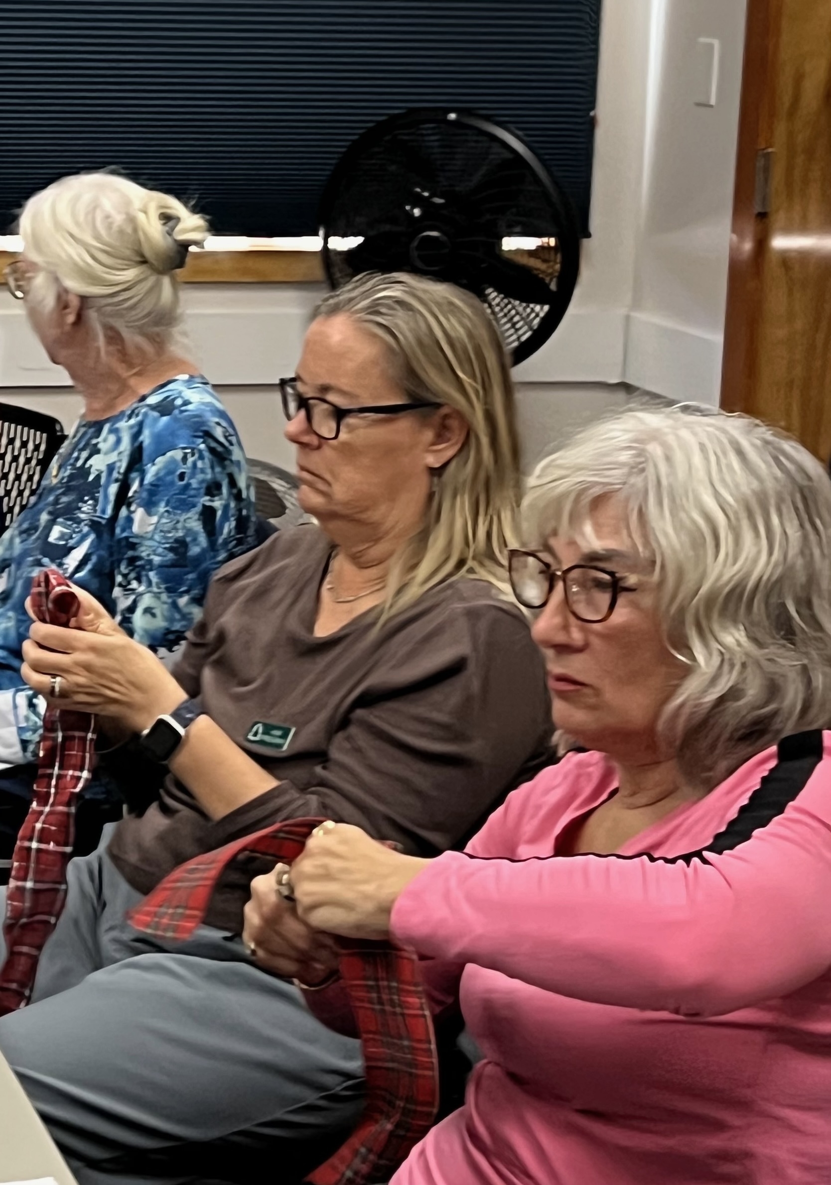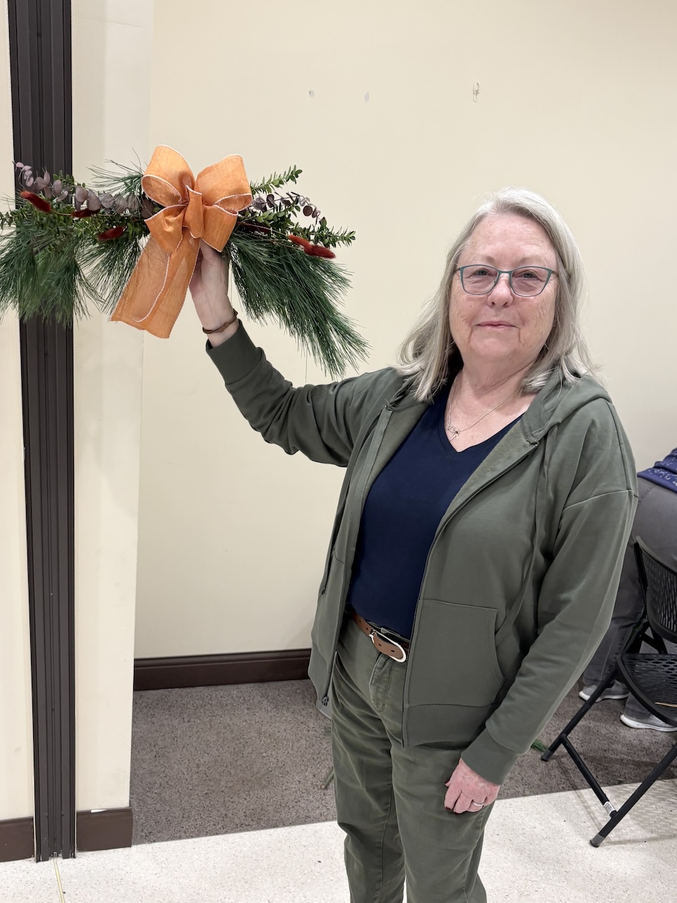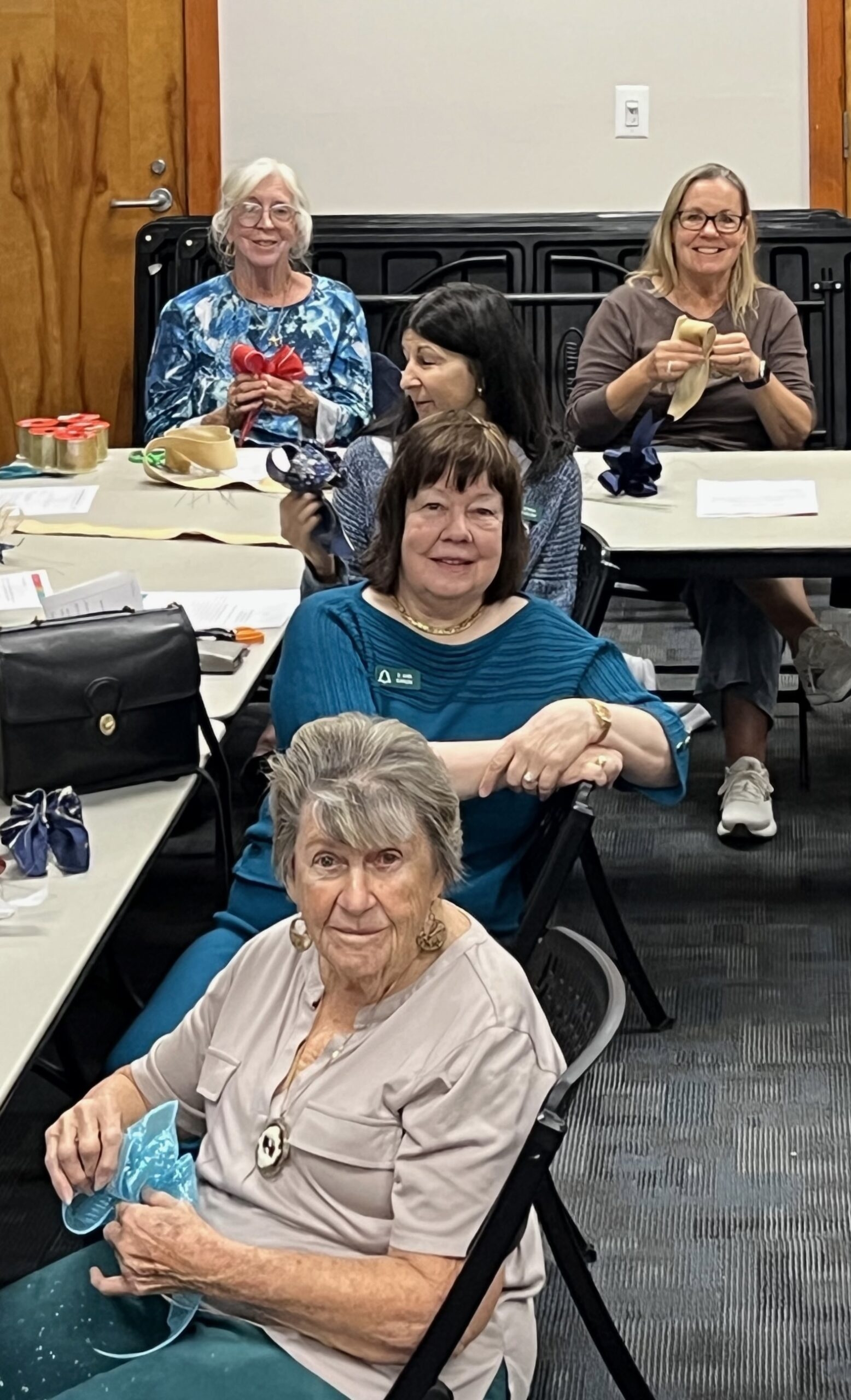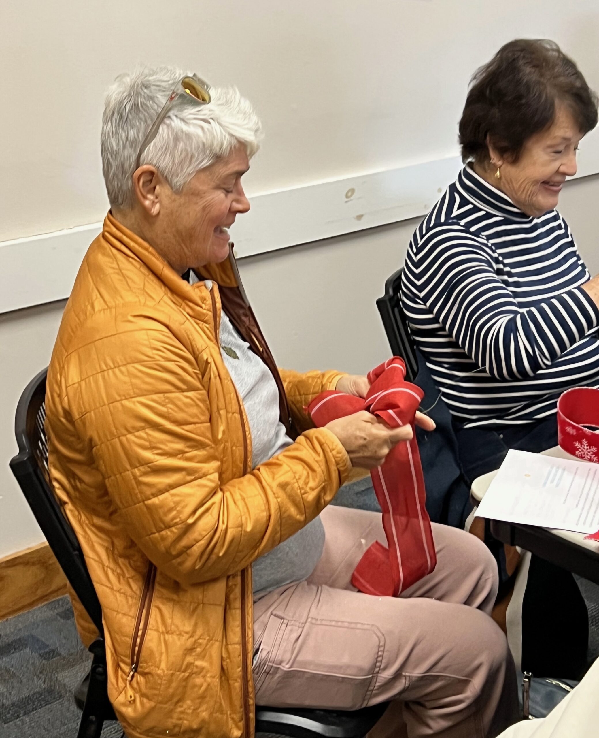 Garden Club members participated in a Bow Making workshop hosted by Marie McCafferty on November 4, 2025 to learn how to make beautiful bows for holiday decorating. Participants received wonderful hands-on training from both Marie and President JoAnne McKee, allowing them to practice this skill using a variety of ribbon types. It was a fun, glitter-filled afternoon for all!